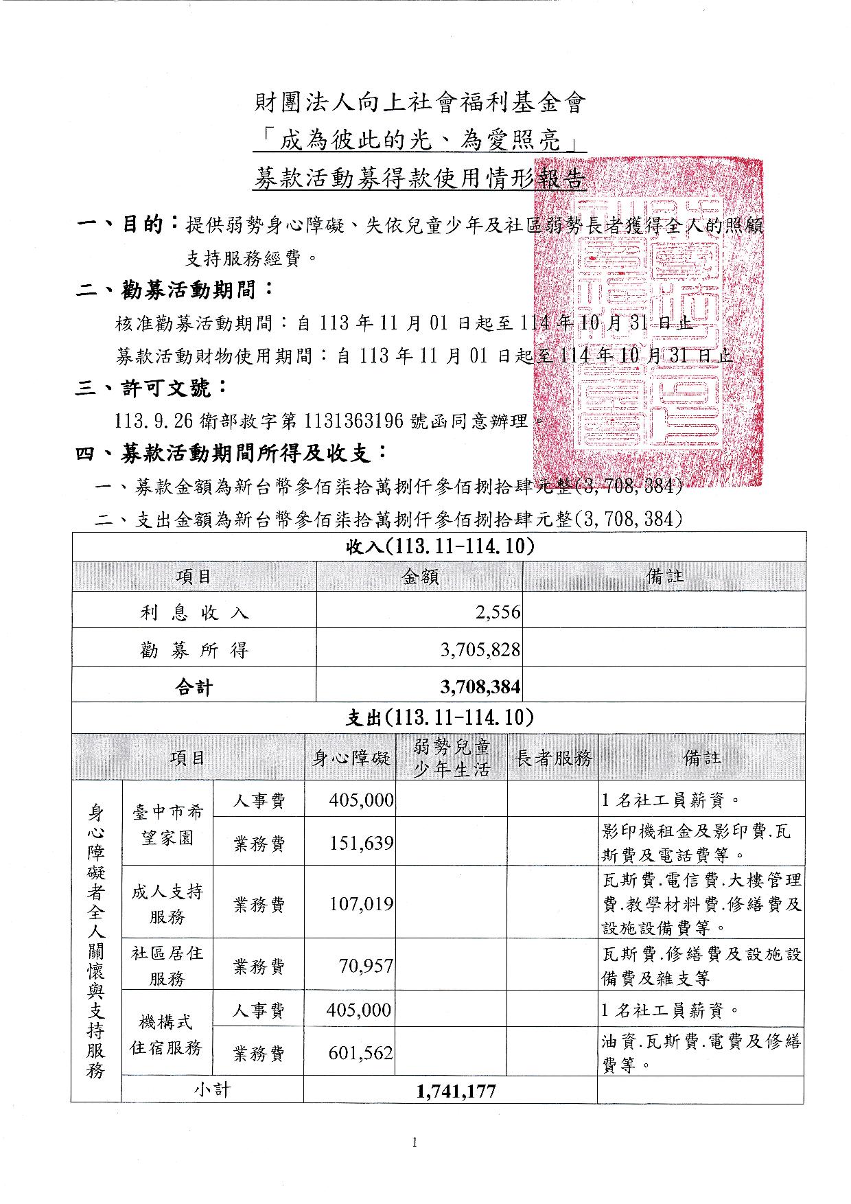 113年「成為彼此的光、為愛照亮」公益勸募活動募得款及使用情形