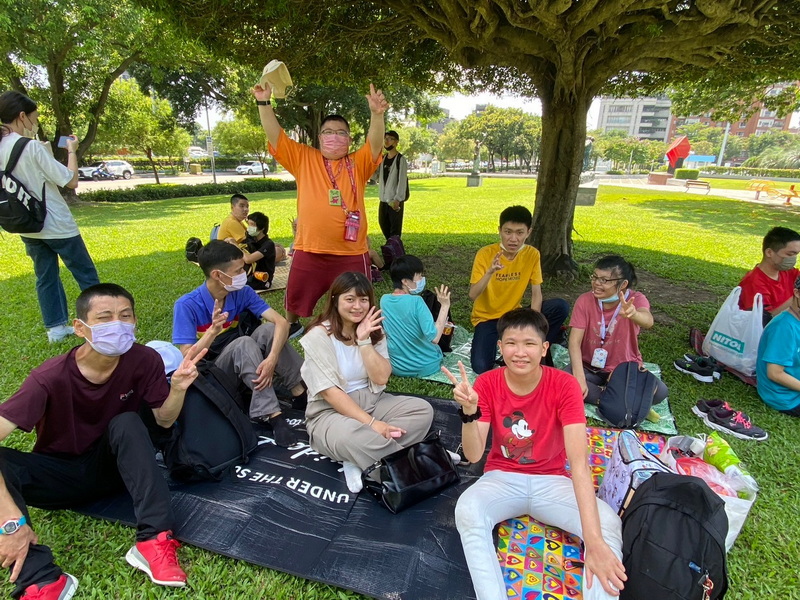 大自然在我們的生命經驗中越來越稀有,所以最後一站我們前往豐樂公園野餐,天氣雖然炎熱,大家還是很開心與社工一起打躲避球,冠○平常不喜歡運動,但今天打躲避球超會躲的,想必今天的運動量可以達標,麗○平常人際互動上較為被動,在打球時看到不一樣的麗○,會主動說:「我要丟你囉!趕快跑!」藉由在公園玩球、聊天分享餅乾,接觸大自然,看看藍天、綠樹、曬曬太陽,讓身心達到真正的放鬆,讓自然環境帶給大家幸福感。