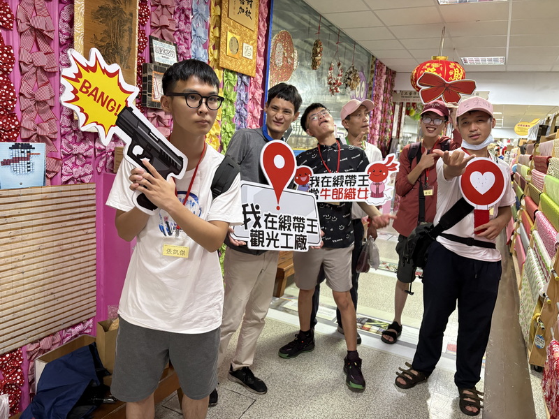 最後到了緞帶王觀光工廠,有一台大型體驗織緞帶的機器,住民很有默契的自行進行分工,努力的盡最大力氣轉呀轉,期待像導覽員說的,跑出一條小緞帶,其過程令我們又驚又喜,但實在是好累呀!更精彩的是,我們還有體驗拿著白色緞帶,依導覽員的指示,自由配色,染出獨一無二顏色的緞帶,進而拿緞帶學習綁出美麗的蝴蝶結,才了解到原來綁出美麗的蝴蝶結沒有這麼簡單,但經過互相學習,最後大家都完成任務,彼此都給對方一個讚!到了最後要離開時,緞帶王觀光工廠還送我們小禮物,讓我們收穫滿滿回家。