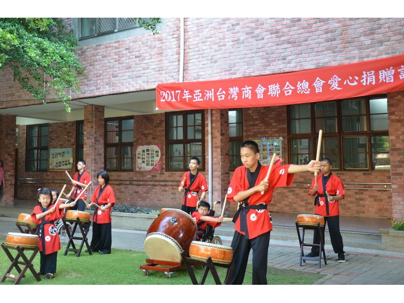 在太鼓-旗鼓震天的熱鬧聲中迎進亞洲台灣商會聯合總會的貴賓們,這次參訪捐贈活動由,希望為我們的孩子建造一個嶄新的家盡一份心力。