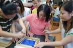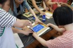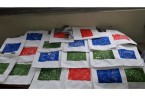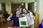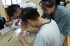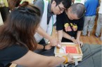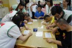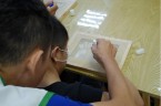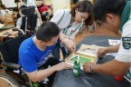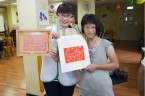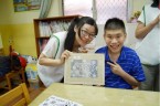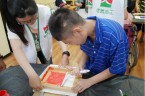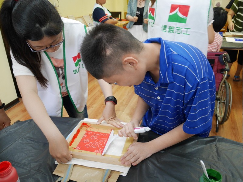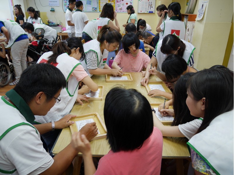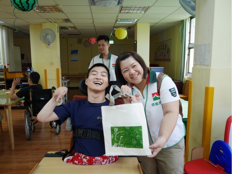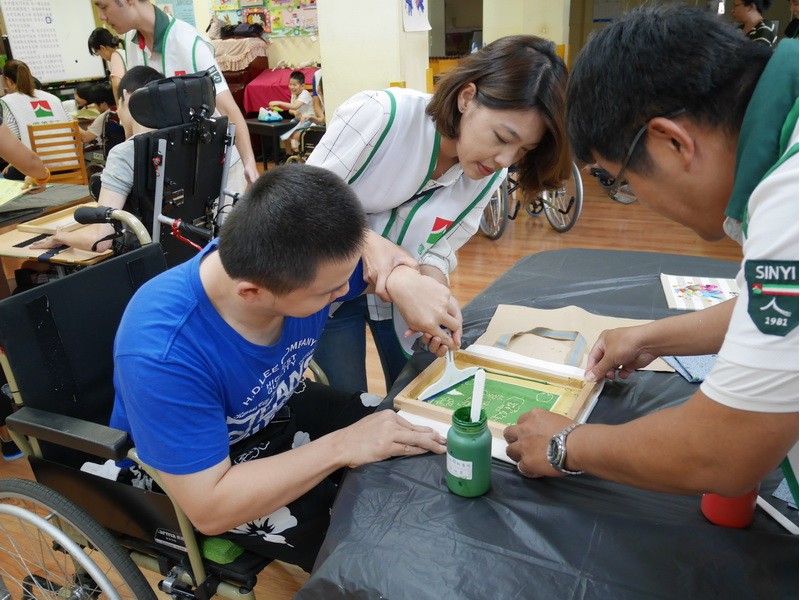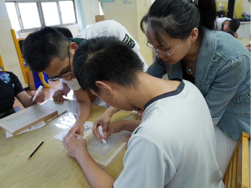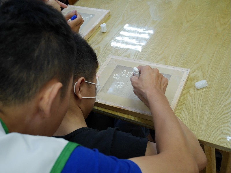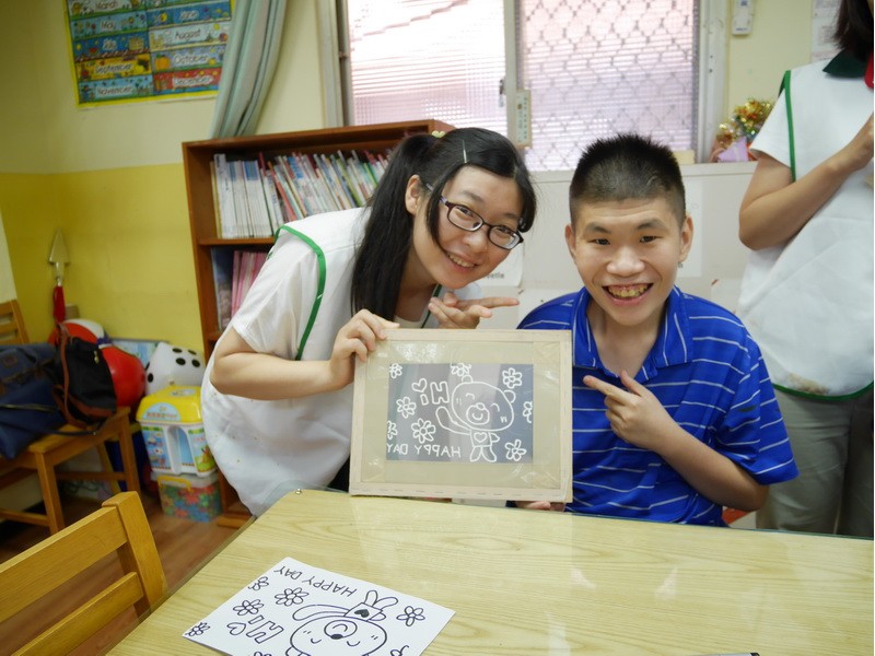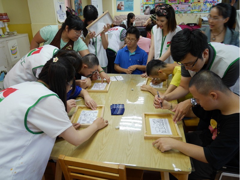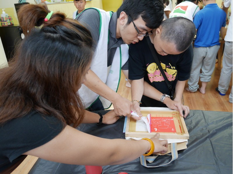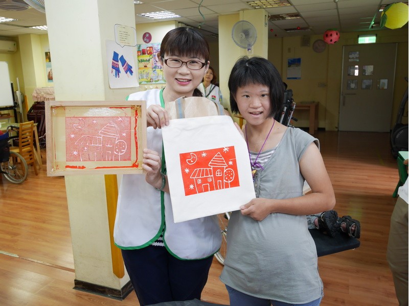 阿維的手不太方便,描圖的時候,志工們幫他把圖畫拿起來架高,讓他可以順利地描圖,阿偉則是說想要自己畫出美麗的圖案,所以他開始用鉛筆打底稿,亮亮跟小慈很有耐心,小心翼翼地描上圖案,然後我們在圖案上塗上立可白,小宇因為用立可白畫得太輕,在志工的指導下,反覆地將線條畫出來,意外地製造出了特別的效果,而琦琦喜歡玩立可白,他把圖案中的線條用立可白全塗一遍,讓畫紙變回了原來的白色,並得意洋洋地笑著,接著我們將畫好的拓印板放在手提袋上,拓印出漂亮的圖案,雖然有些人拓印時的力道太輕,以致拓印的圖案有些部位沒有顏色,但大家七手八腳地補救著,讓拓印出來的結果更完美,最後,大家聚在一起,欣賞彼此的作品,許多人都能一眼就看出自己的作品是哪一個,也很滿意自己的作品。