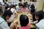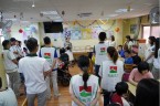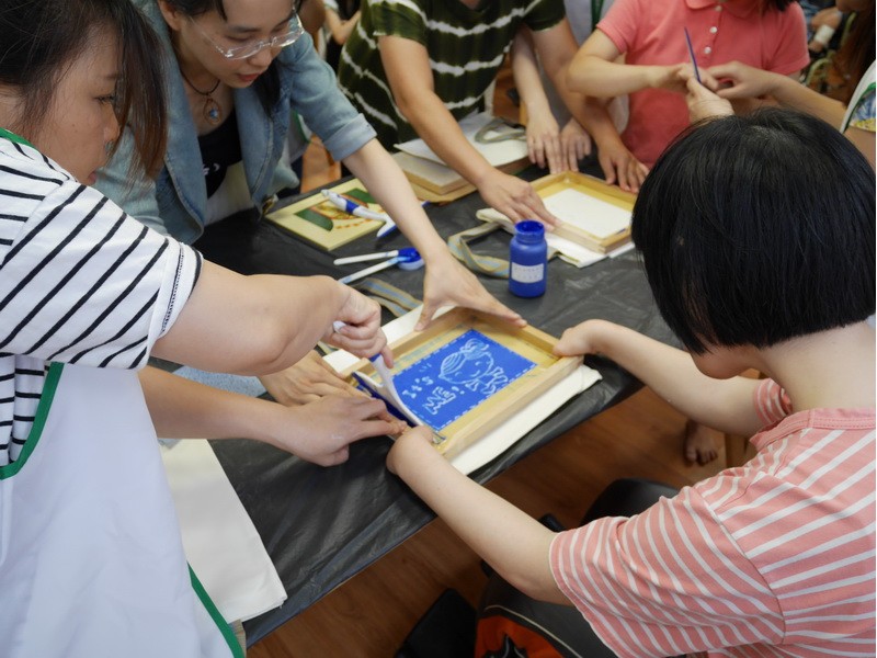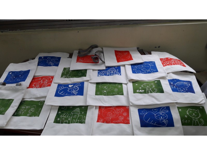今天有美術老師來教我們玩拓印,老師準備了好多豐富的用具,並解說要做手提袋絹印,而信義房屋的大哥哥大姐姐們,也會跟我們一起合作。
