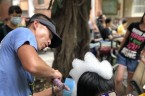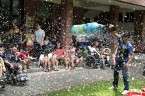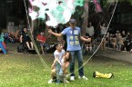 首先,泡泡先生用一個圓管子在我們的頭上吹出各式帽子,霎那間變出了兔子,公雞、恐龍等,不想戴時,風一吹就消失了;接著是連串的泡泡,大大小小映著七彩虹光,引起孩子的的大聲歡呼,超大的泡泡等不及罩住全身就讓大家忍不住要去碰觸,而最引人注意的是那雪花片片從天降下,一碰就化掉了。