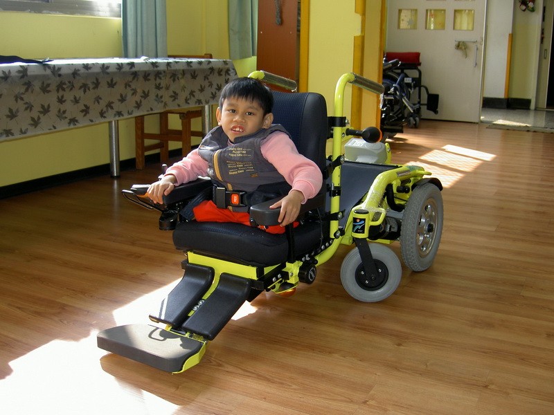 阿富的第一個行動輔具是貼心的教保員找的,教保員怕阿富手腳磨損特地找了滑板車讓他使用,直到國小三年級,院方開始尋找合適行動輔具,當時體重僅7公斤,若用手推輪椅可能會翻覆,因此找來一個特小椅座的電動輪椅讓阿富使用,後來治療師發現日本有一款椅座可以下降到榻榻米的電動輪椅,這種升降設計很適合阿富,但是臺灣當時沒有這款電動輪椅,不管是進口或請廠商開發都需要一筆龐大費用,就在這困難的時候,阿富遇上了第一位貴人,低調行善的企業家願意支持找廠商開模設計,於是透過輔具中心祝老師連結「財團法人鞋類暨運動休閒科技研發中心」團隊來幫忙,經過多次量測與討論,修改再修改,耗時一年,終於完成了「潛降式電動輪椅」,阿富自選了亮麗的黃色,並且取名為「大黃蜂」,從此他的高度、視野可以和同儕一樣,這部大黃蜂將承載阿富的夢想起飛。特別感謝這位善心人士,您一個小小的舉動成就一個孩子大大的夢想。