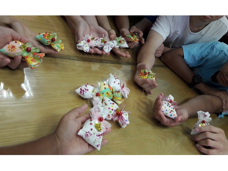 最後,大哥哥大姊姊手作香包,運用中藥行所調配的香粉,自己親自動手,做出一個個漂亮又能趨吉避凶的香包,再拿到市場去義賣,和社區的居民同享。義賣的過程中,有許多熟悉的鄰居們,紛紛比讚鼓勵,熱情地購買香包,讓我們體會到了,端午節,不只是個傳統有意義又好玩的節日,更讓我們感受了人間處處有溫情。