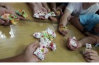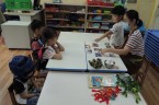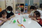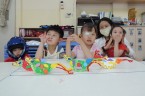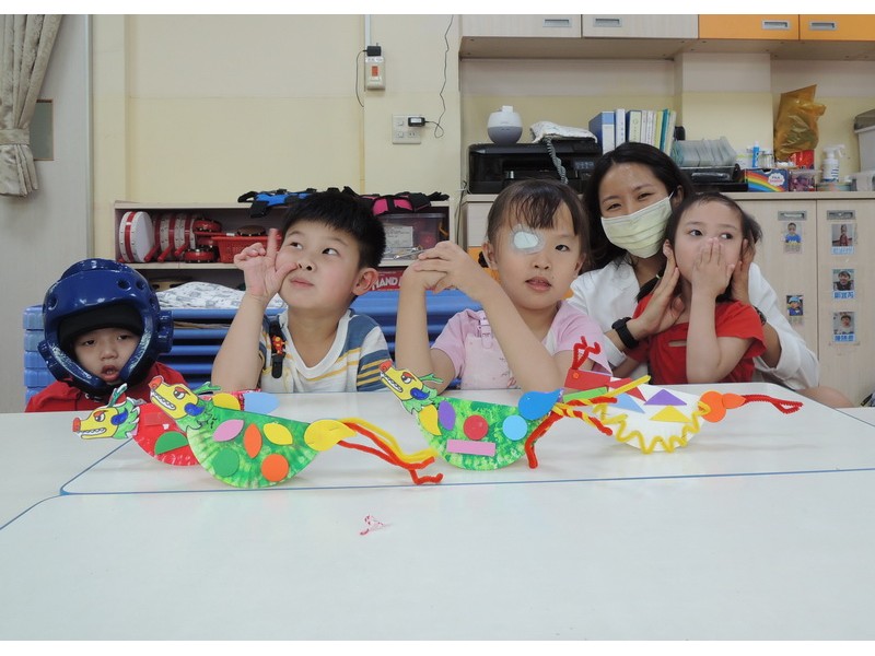 接著進行包粽子體驗,雖然做的造型紙粽子不能吃,但我們都很認真地學習摺粽葉和綁粽子。再來是小龍舟手作課程,運用毛根和紙盤,發揮創意,一艘艘小龍舟,排排立著漂亮極了。龍舟賽一直是端午節的重頭戲之一,在軟墊上模擬龍舟快快划、向前進的模樣,再配上龍舟競賽那加油吶喊的音樂聲,讓大家玩得哈哈大笑。