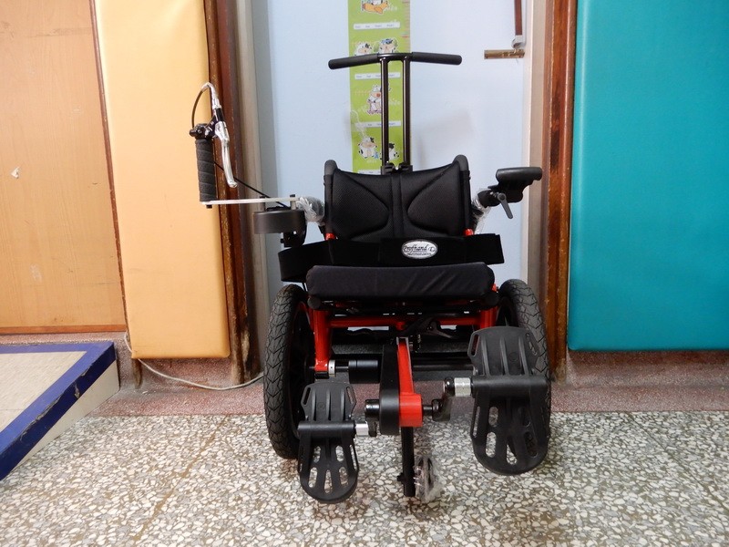 本院獲得臺中市向上扶輪社的「社區肢體障礙者前瞻照護計畫」捐贈2台腳踏式輪椅,期望能協助身心障礙者穩定情緒及提升行動自主性。大多數身障者因下肢先天障礙不良於行,在移行上多是藉由一般輪椅或電動輪椅導致其雙腳幾乎難有活動機會,因為輪椅多為手推或手控型,雙腳並無參與活動,以至於下肢肌力和功能漸漸變弱,最終甚至可能影響了身體健康及生活品質。事實上有一群身障者其雙腳功能雖然無法達到行走或站立,但是當他們躺臥下來時雙腳是可以做出彎曲和伸直的動作,這樣的孩子使用腳踏輪椅時,藉由下肢交替踩動的方式可達到雙腳運動的效果,同時也可促進血液循環。