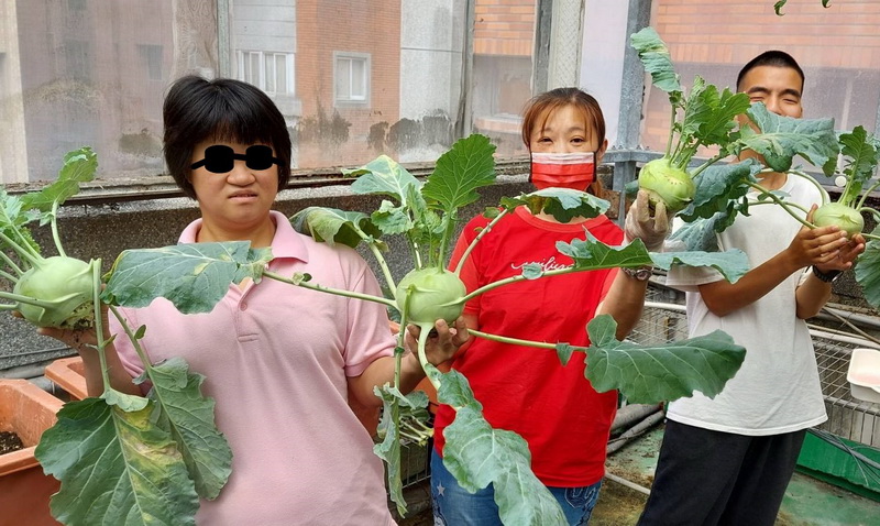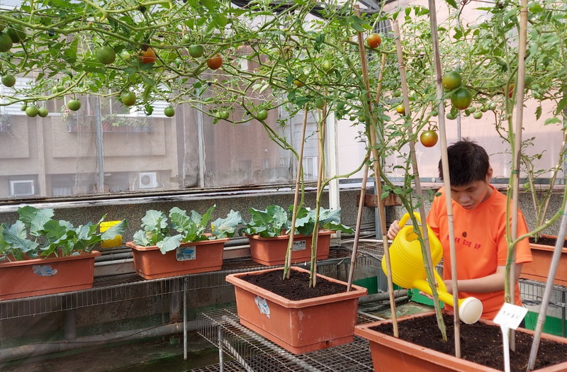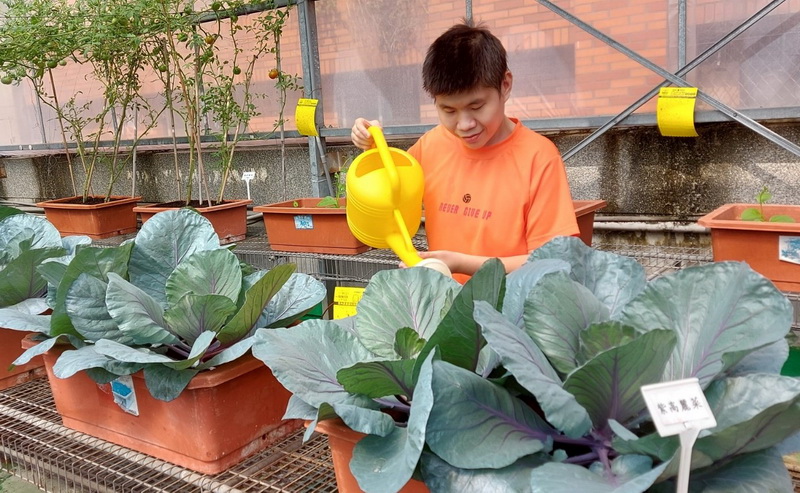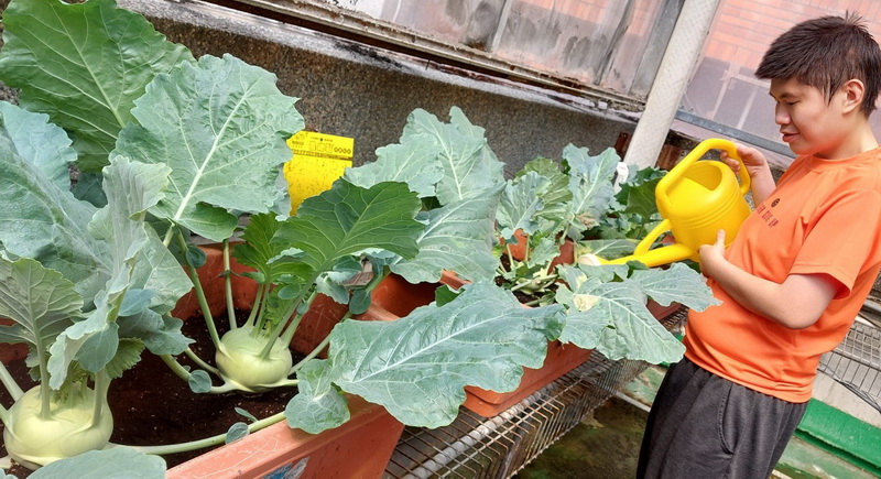 希望溫室內種植的蔬菜種類很多,就像黑柿蕃茄,是從去年的十月開始種植的,紫高麗菜和大頭菜,則是從去年的十二月份開始,醜豆是今年二月份的新成員,除了這些蔬果以外,溫室尚有其他種類的葉菜類蔬。每天園藝組的孩子們,都會跟著老師一起到花園與溫室照顧這些植物們。