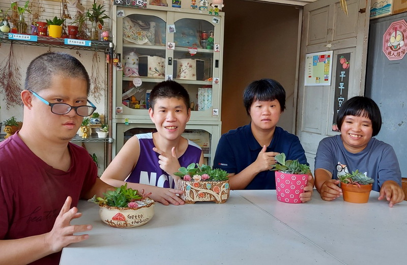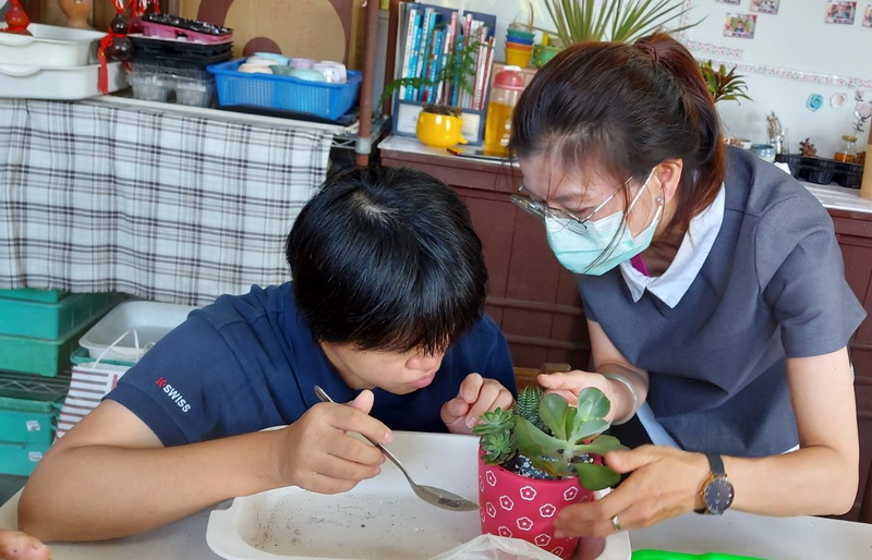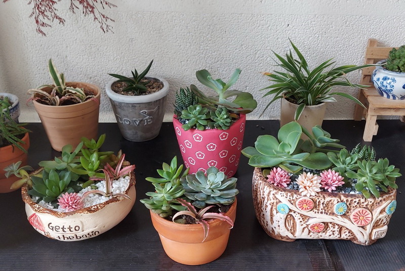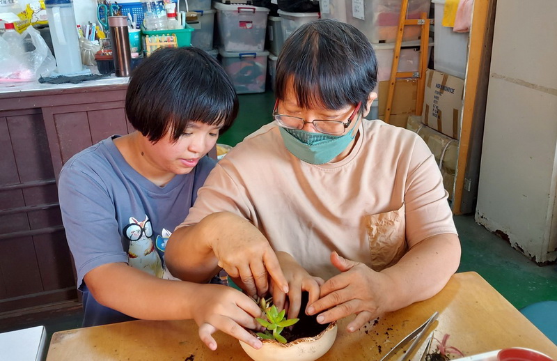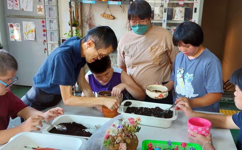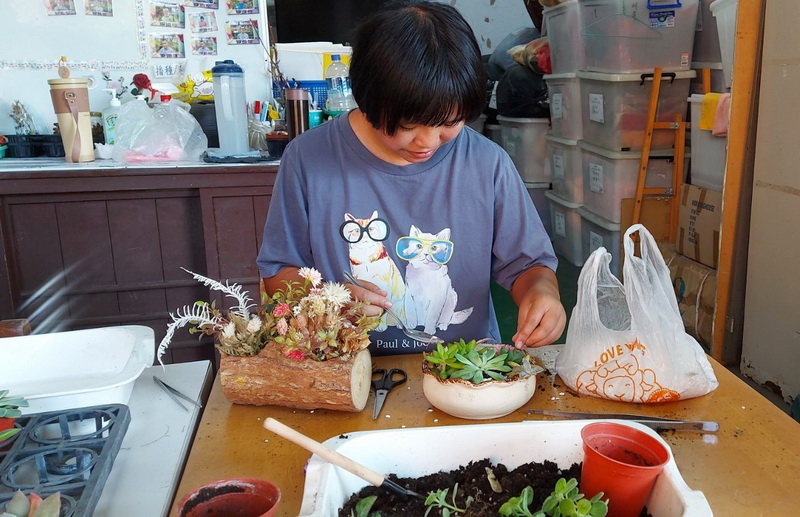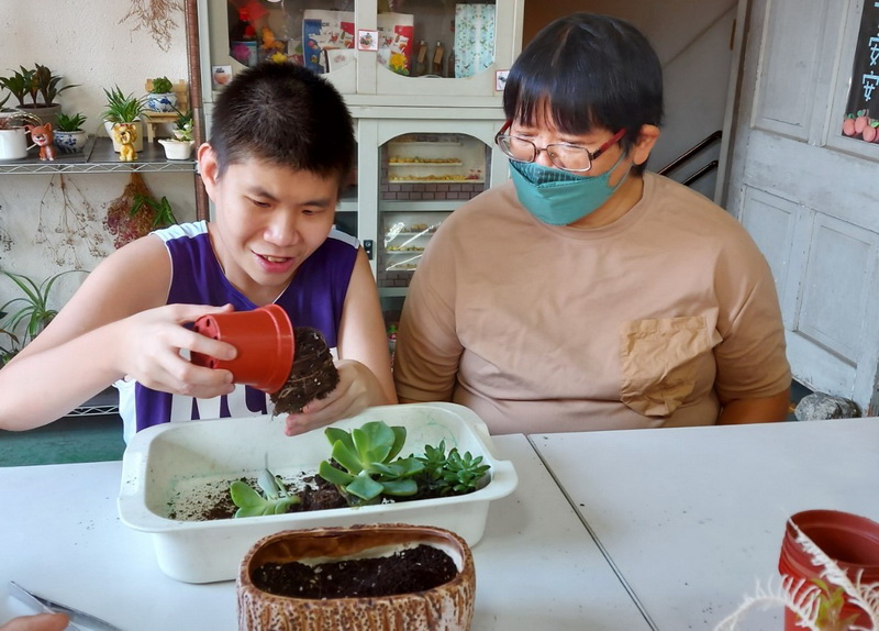 多肉植物盆栽的組合,是孩子們喜歡的一堂課。首先,老師先請大家挑選喜歡的盆器,並在空盆器底下舖上盆底網以防止漏土,然後在盆內放入大約7分滿的土壤,這些歩驟大夥兒都很熟練地完成了。