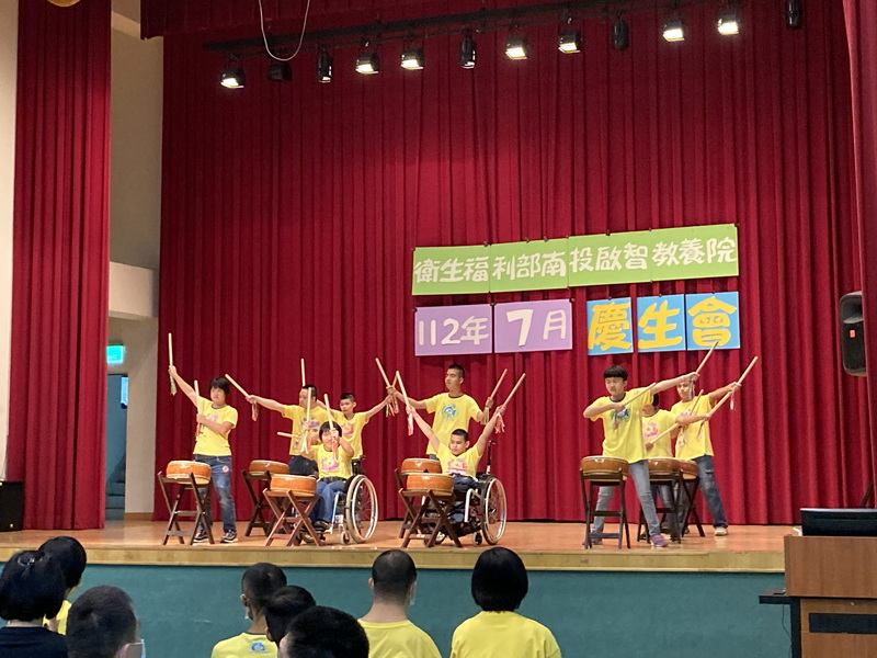 育嬰院的太鼓隊、陶笛隊及合唱團經歷3年疫情,終於在8/18跨出院區來到南投教養院表演交流!太鼓隊成員氣勢宏偉揭開序幕,雙手舞動著鼓棒,帶來「撼動」表演曲目,這次無搭配音樂旋律,靠著成員間彼此的默契,整齊有力的節奏,鼓聲短促卻相當有震撼力,這撼動人心的鼓聲,讓舞台充滿了巨星光彩,台下觀眾看得目不轉睛。接著是陶笛吹出優美的音色,清脆嘹亮的聲音配上經典的樂章「四月望雨舞曲版」,將台語老歌中副歌橋段綜合成一首舞曲。最後是向上合唱團成員的演出,以撫慰人心充滿正能量的歌聲,合唱「野玫瑰」、「小小世界」及「我相信」,疫情後成員第一次外出表演,難得的機會讓孩子有舞台可以展現3年練習的成果,表演結束後台下聽眾還不停叫喊安可!這次的演出讓育嬰院及南投教養院的師生進行了一次美好的音樂及熱情交流。