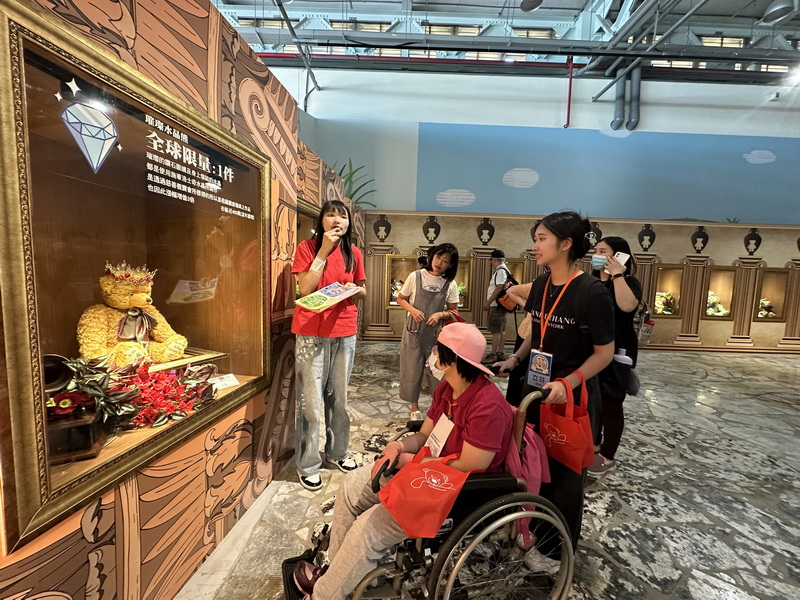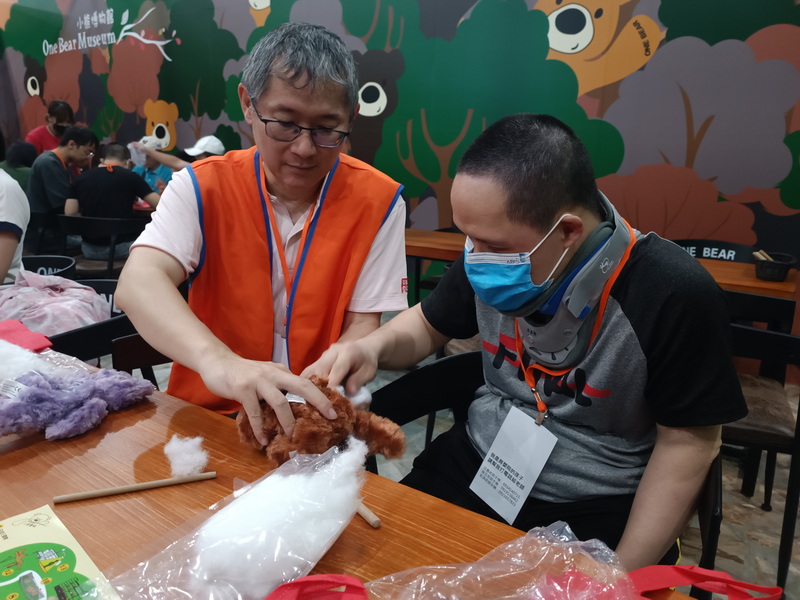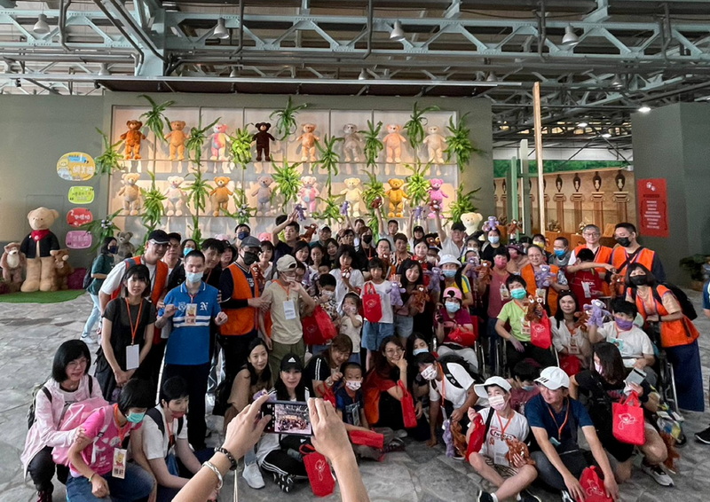 下午前往小熊藝術村農創園區,活動開始是一起做小熊鑰匙圈,有一些孩子沒有足夠的精細動作可以進行DIY活動,我們引導志工讓孩子們碰觸看看,有些孩子摸到軟綿綿的棉花跟小熊,臉上的表情更顯放鬆,當孩子們拿到自己完成或是由志工協助完成的作品,都非常開心。結束後的導覽及自由時間,社工跟老師們都握時間為每一位孩子拍攝美美的網美照,為孩子的人生留下美好的一章。活動結束前裕融企業及台北國際旅行社的志工及工作人員帶著孩子們上車,並且互說珍重再見,希望這次的活動帶來的溫暖可以在彼此的心中滋長。