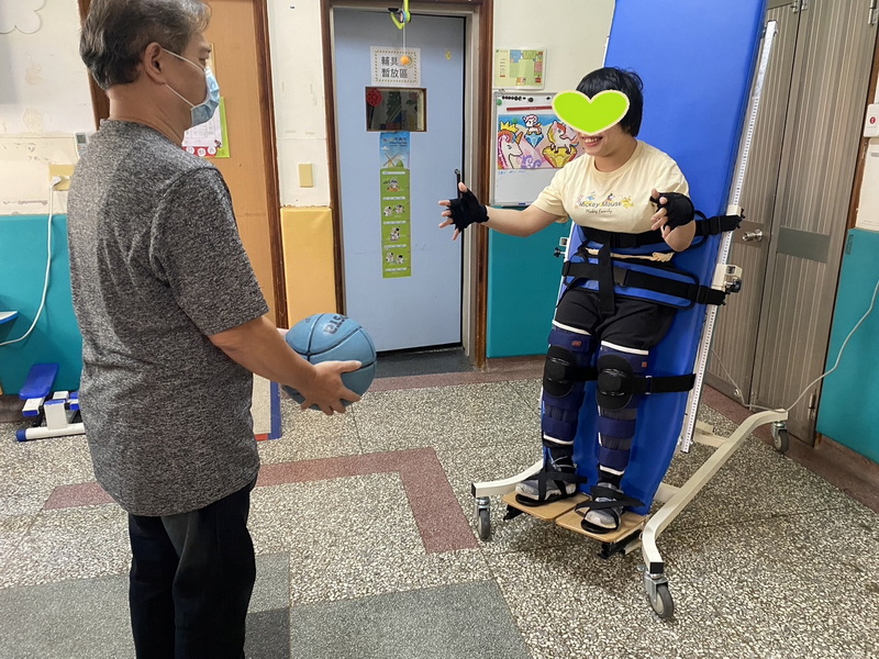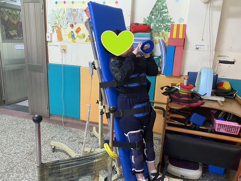 「站立架」是院內常見的輔具設備,提供孩子站姿擺位,改變視野讓中重度的孩子有不同的活動參與經驗;同時也提供服務對象下肢關節伸展、下肢承重進而避免肌肉流失減緩退化的速度。