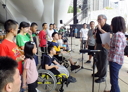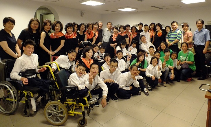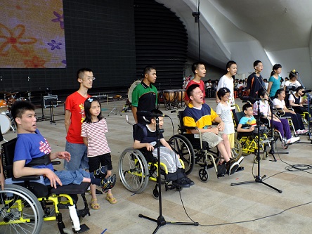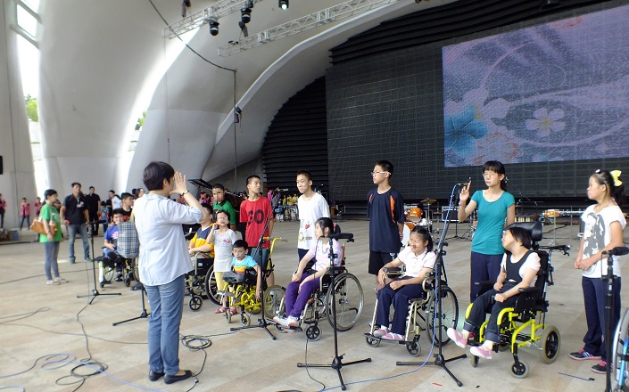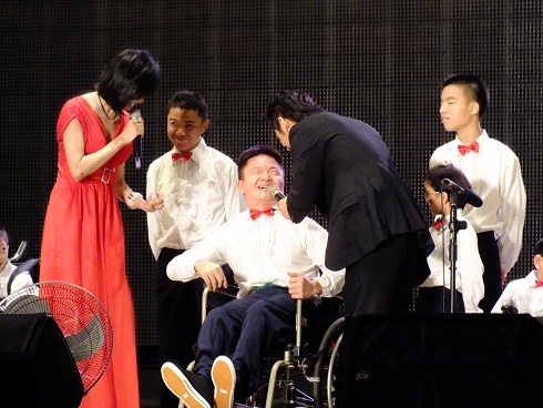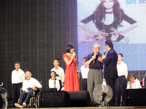終於到了演出時刻,大家帶著雀躍的心情與笑容上台,主持人簡單介紹了育嬰院後,還特地訪問了阿偉與阿富,他們雖然無法流暢地表達,但樂觀、充滿幸福的態度,讓許多民眾留下深刻印象,會後也在FB上網銀基金會的紛絲團留言表示感動與支持。