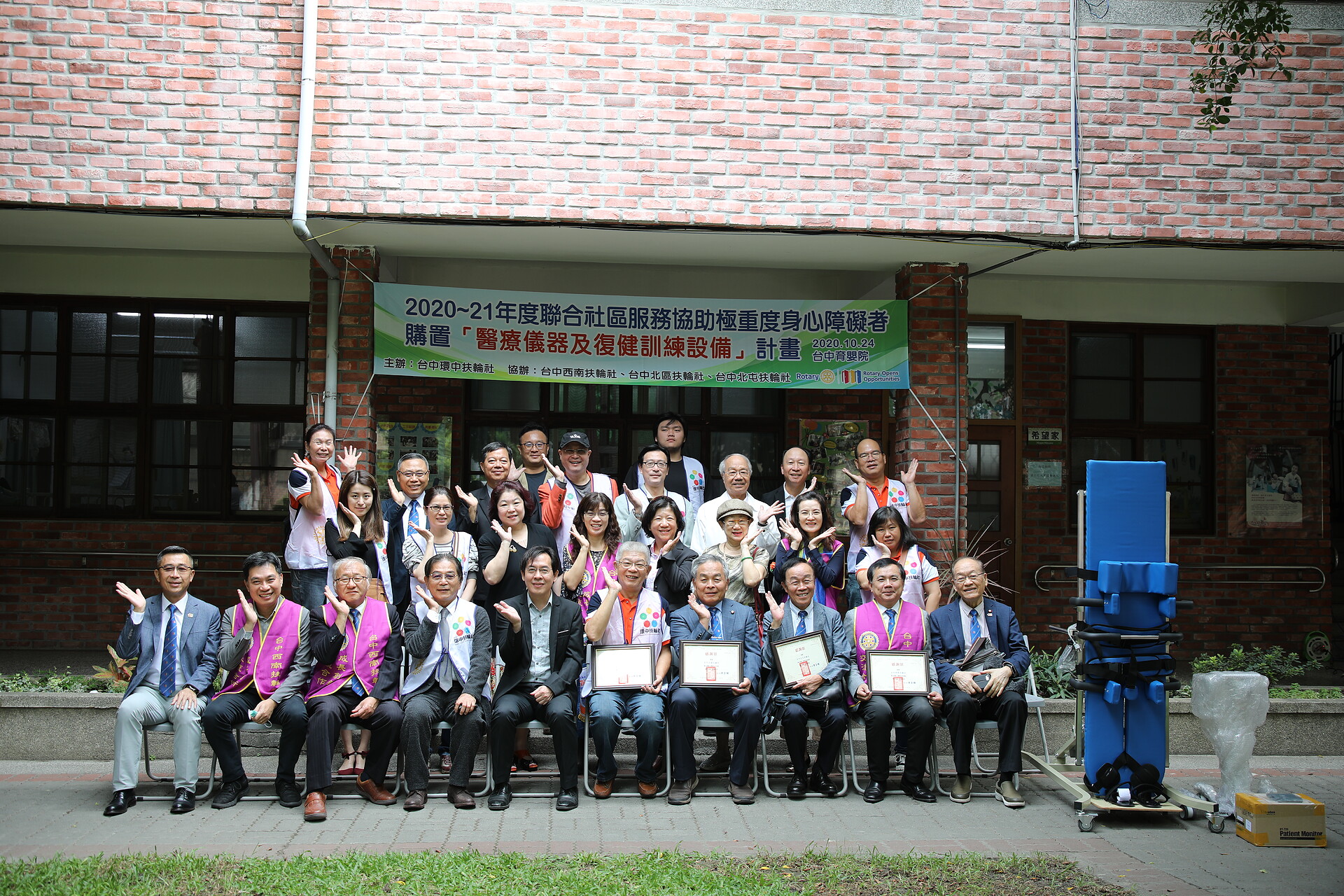感謝「台中環中社」張峻誠社長及施昭彰分區助理總監帶領「台中西南社」、「北屯社」、「北區社」協助台中育嬰院購置「電動背躺式站立架」及「生理監視器(醫療專業型)」1台。