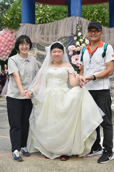 希望家園一直本著去機構化、融入社區化的服務理念,打造一個沒有歧視與平等的環境。身障者在感受美好與幸福的這件事與一般人是一樣的,所以將它化為具體的行動力。這次的活動除了成就服務對象的自我選擇與決策,得以挑選自己喜歡婚紗禮服的款式外,最重要的是帶領著天使們走向社區,活動的地點在大里標地公園--「金城公園」~這是充滿活力的社區公園,工作人員將公園佈滿紅地毯,尤如星光大道般的喜氣~~