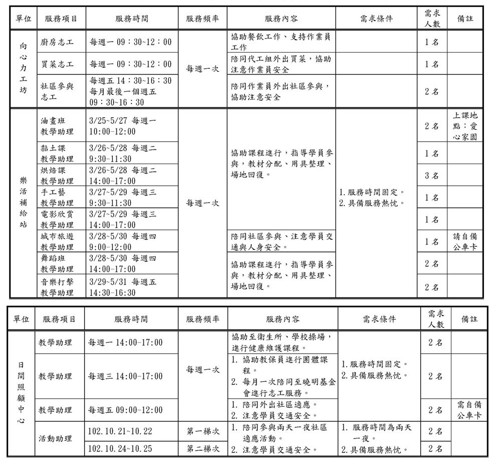 二、條件:需長期固定服務,最少服務滿60小時。願遵守「志工倫理守則」及本會志工服務規定者。