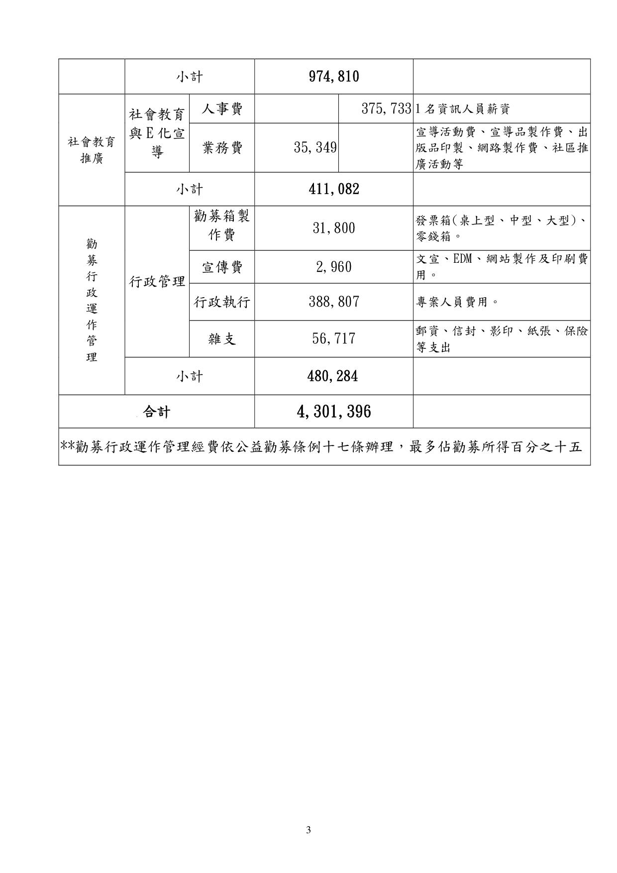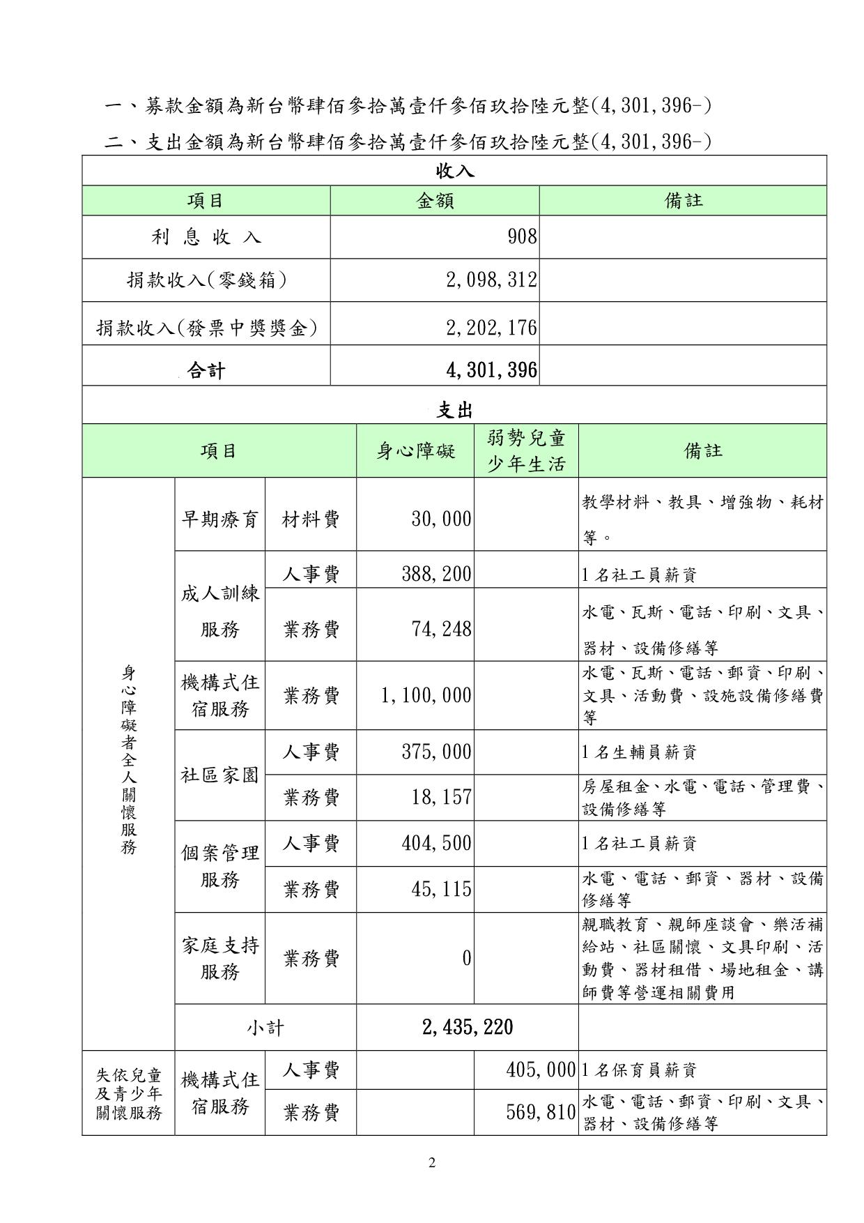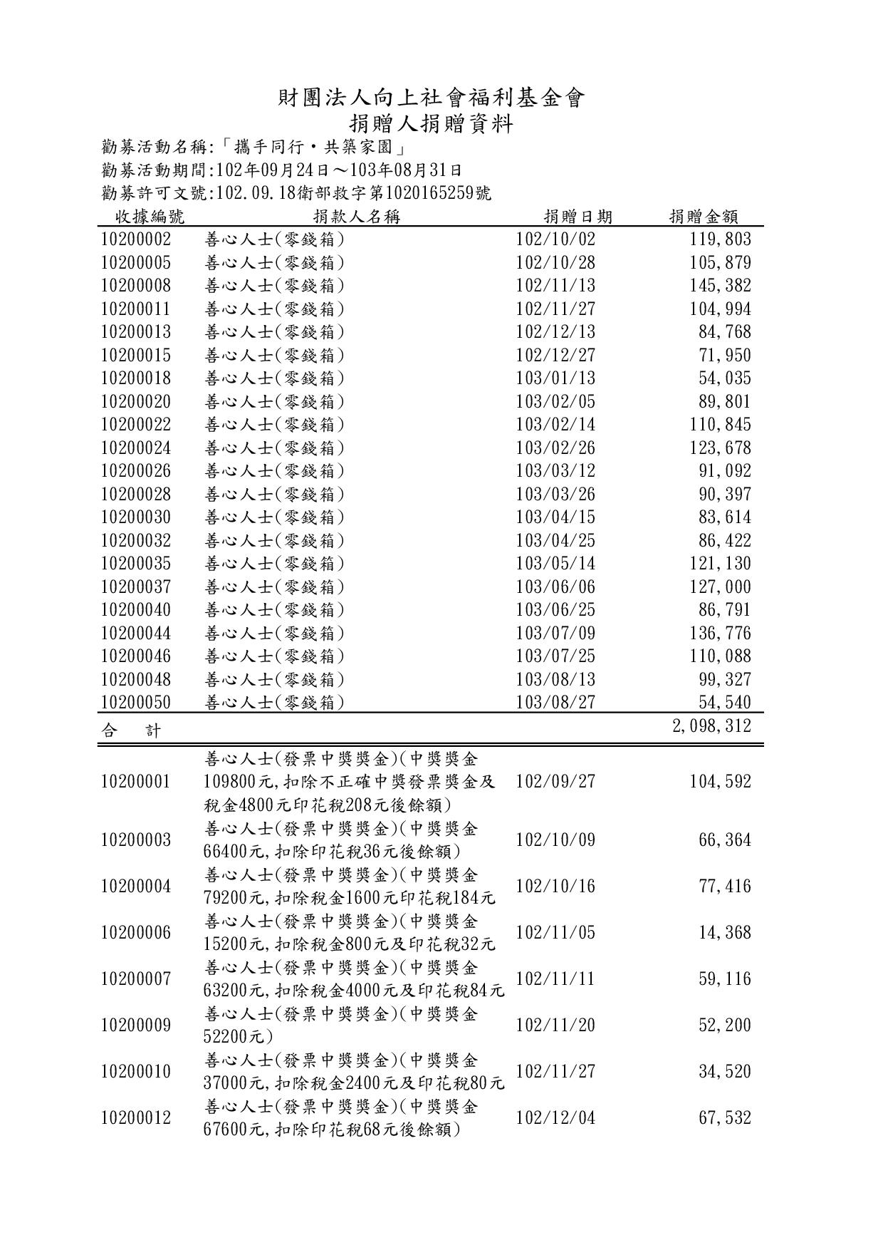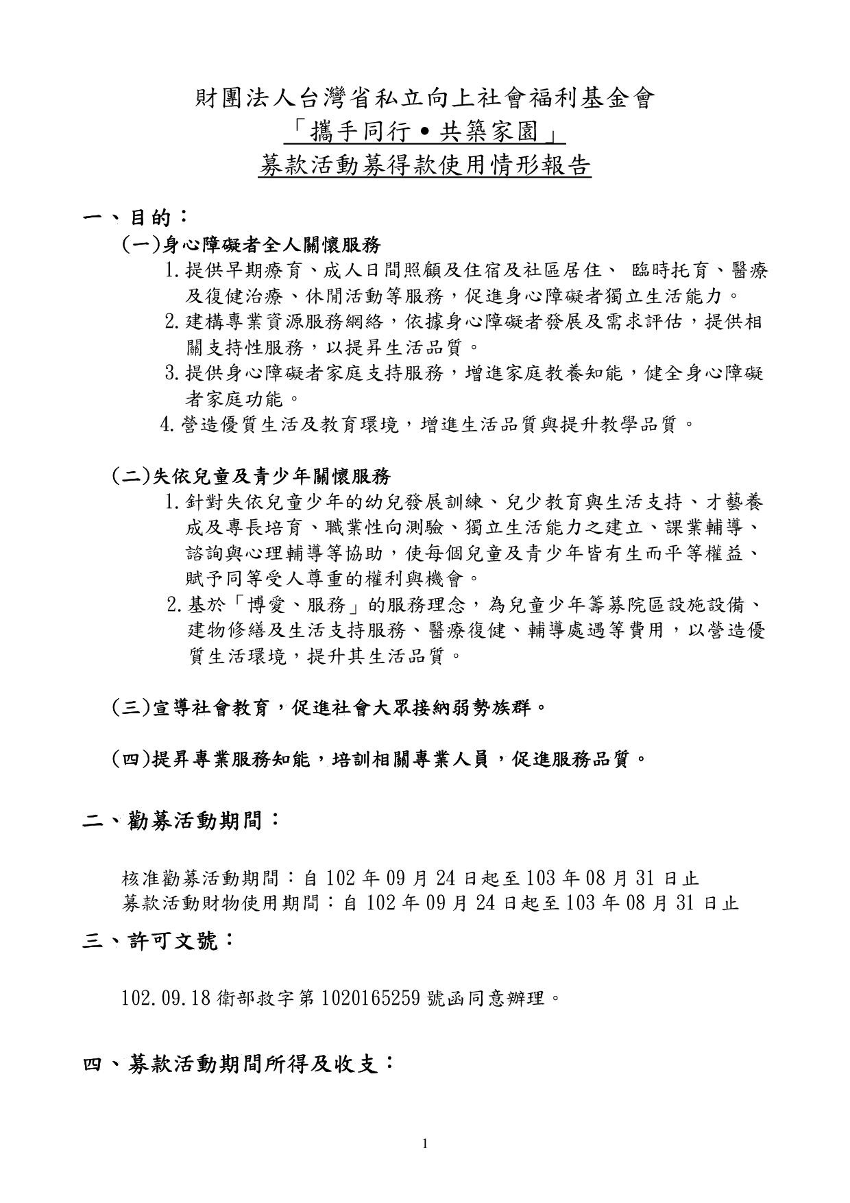 102年「攜手同行‧共築家園」勸募活動募得款使用情形報告