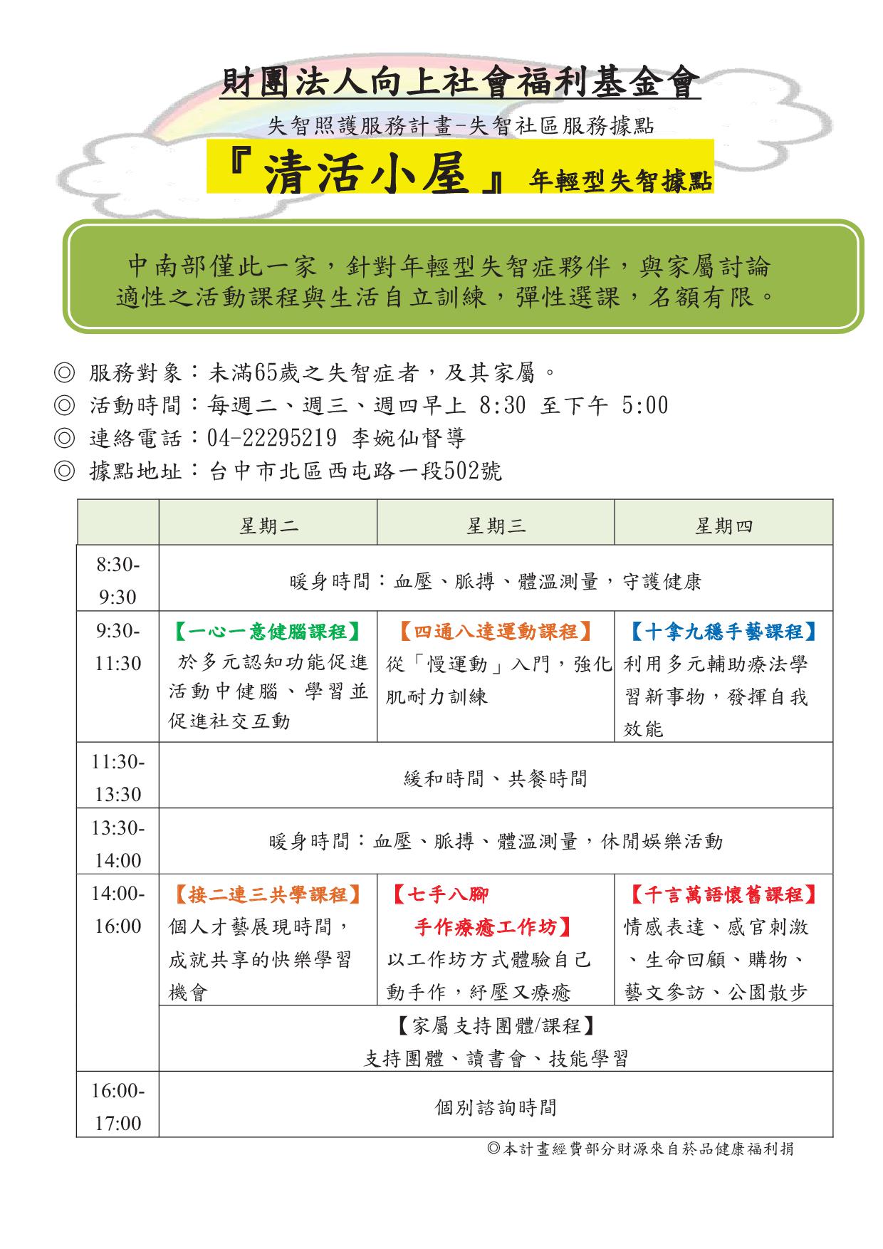 向上清活小屋(年輕型失智據點) 110年課表~歡迎未滿65歲失智者報名!