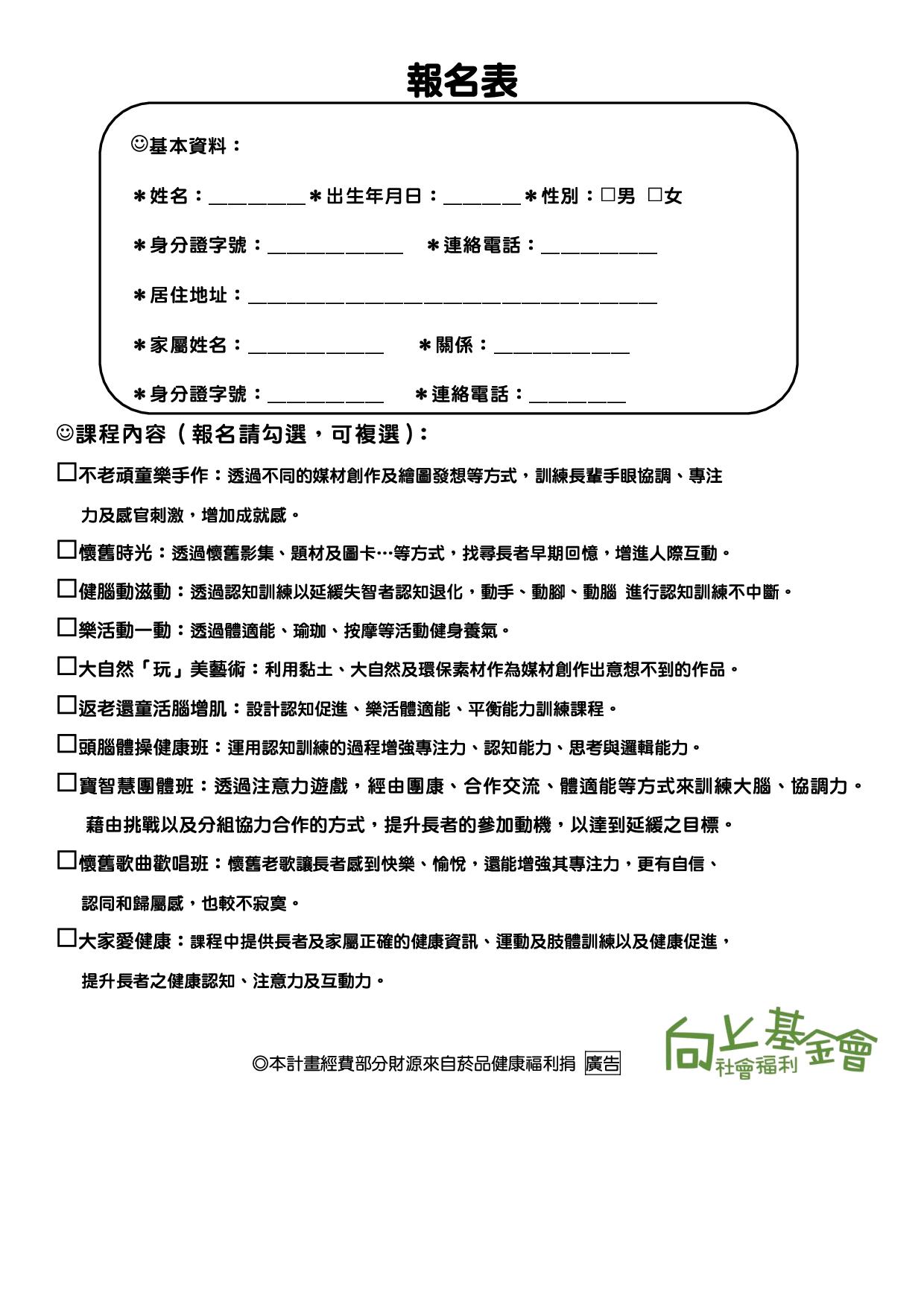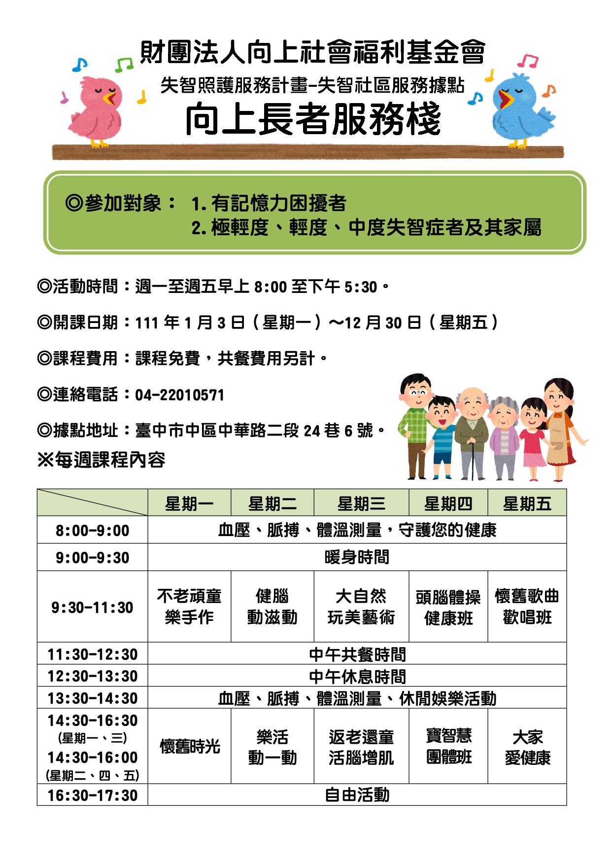向上長者服務棧(中區中華路失智據點)111年課表~歡迎失智長輩報名,保腦保健康~