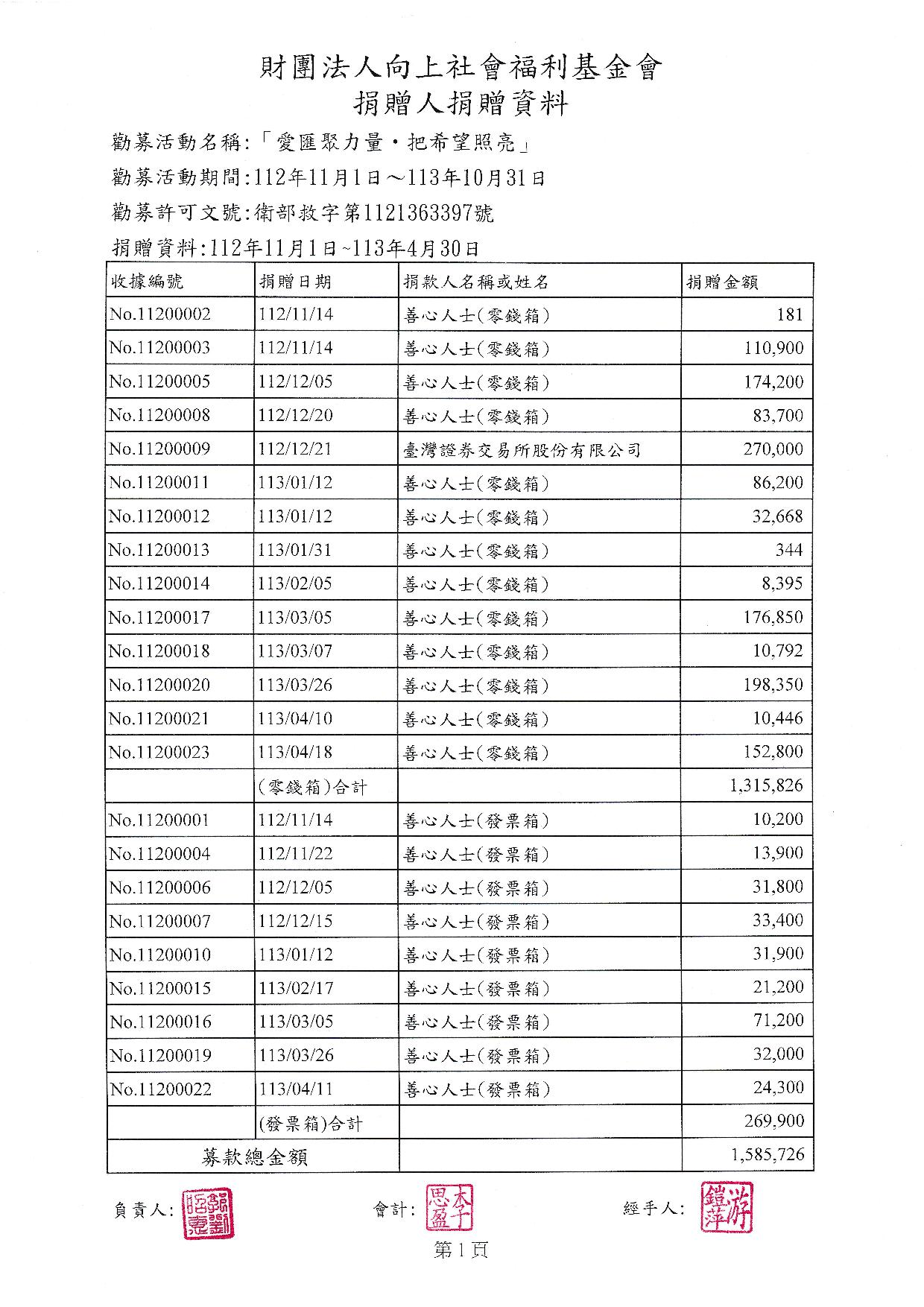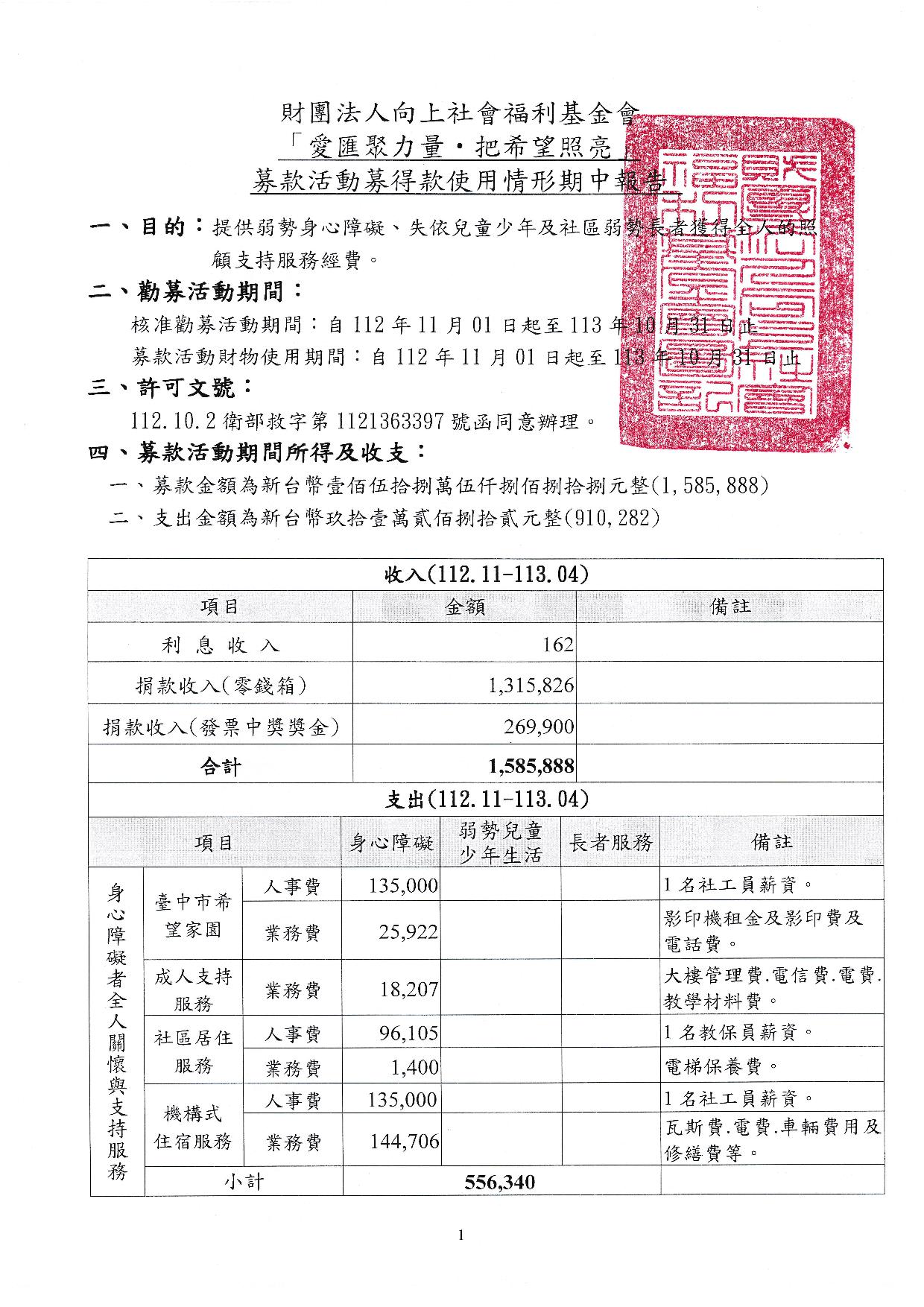 112年公益勸募「愛匯聚力量·把希望照亮」募得款及使用情形期中報告