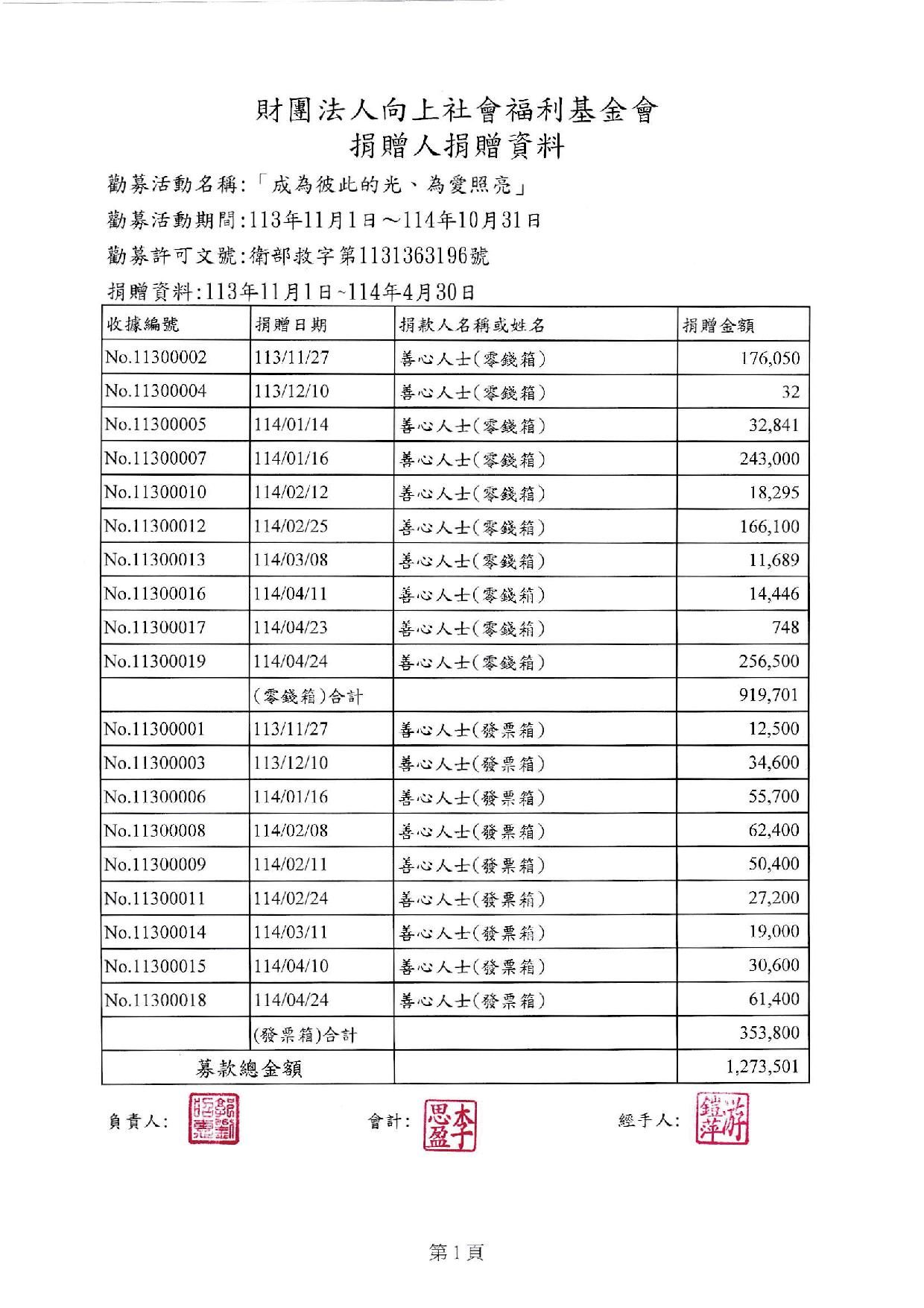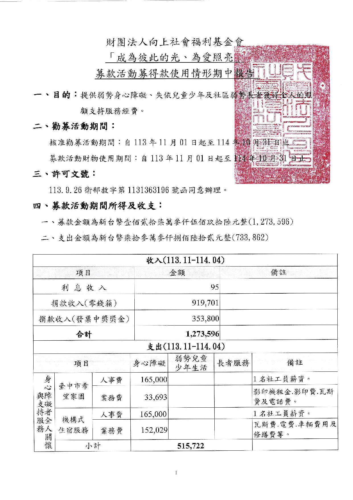 113年公益勸募「成為彼此的光、為愛照亮」募得款及使用情形期中報告